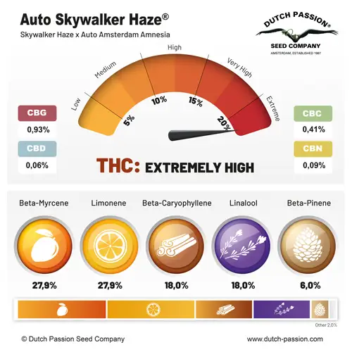 A Auto Skywalker Haze é atualmente a autoflora mais potente da Dutch Passion, com níveis de THC acima de 25% ! 26,2% para ser exato! Isso torna esta cepa ainda mais forte do que a maioria das cepas de sementes de fotoperíodo atualmente disponíveis em todo o mundo.